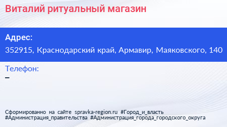 Виталий, ритуальный магазин по адресу 352915, Краснодарский край, Армавир, Маяковского, 140 в дальнейшем Организация, размещена в следующих категориях: