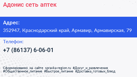 Адонис, сеть аптек по адресу 352947, Краснодарский край, Армавир, Армавирская, 79 в дальнейшем Организация, размещена в следующих категориях: