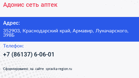 Адонис, сеть аптек по адресу 352903, Краснодарский край, Армавир, Луначарского, 398Б в дальнейшем Организация, размещена в следующих категориях: