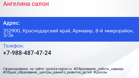 Ангелина, салон по адресу 352900, Краснодарский край, Армавир, 8-й микрорайон, 3/3а в дальнейшем Организация, размещена в следующих категориях: