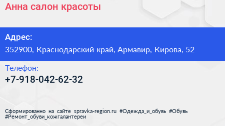 Анна, салон красоты по адресу 352900, Краснодарский край, Армавир, Кирова, 52 в дальнейшем Организация, размещена в следующих категориях: