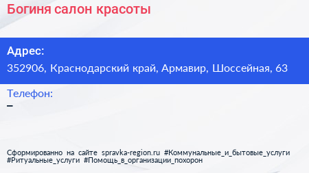 Богиня, салон красоты по адресу 352906, Краснодарский край, Армавир, Шоссейная, 63 в дальнейшем Организация, размещена в следующих категориях: