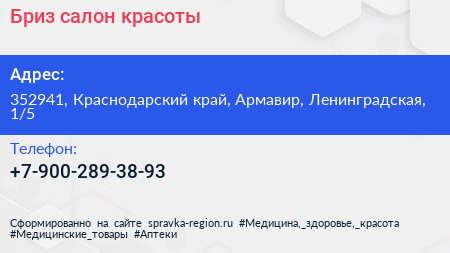Бриз, салон красоты по адресу 352941, Краснодарский край, Армавир, Ленинградская, 1/5 в дальнейшем Организация, размещена в следующих категориях: