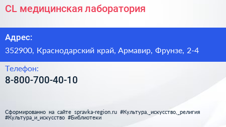 CL, медицинская лаборатория по адресу 352900, Краснодарский край, Армавир, Фрунзе, 2-4 в дальнейшем Организация, размещена в следующих категориях: