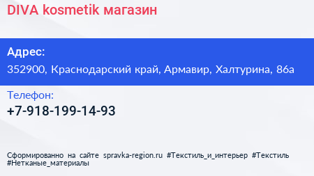 DIVA kosmetik, магазин по адресу 352900, Краснодарский край, Армавир, Халтурина, 86а в дальнейшем Организация, размещена в следующих категориях: