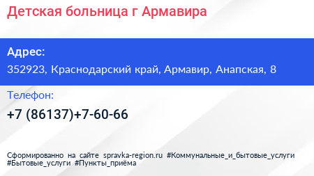 Детская больница г. Армавира по адресу 352923, Краснодарский край, Армавир, Анапская, 8 в дальнейшем Организация, размещена в следующих категориях: