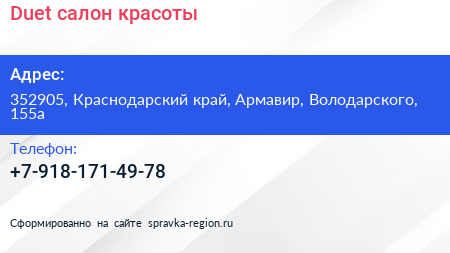 Duet, салон красоты по адресу 352905, Краснодарский край, Армавир, Володарского, 155а в дальнейшем Организация, размещена в следующих категориях: