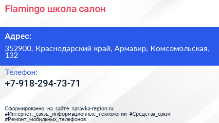 Flamingo, школа-салон по адресу 352900, Краснодарский край, Армавир, Комсомольская, 132 в дальнейшем Организация, размещена в следующих категориях: