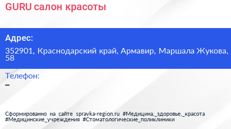 GURU, салон красоты по адресу 352901, Краснодарский край, Армавир, Маршала Жукова, 58 в дальнейшем Организация, размещена в следующих категориях: