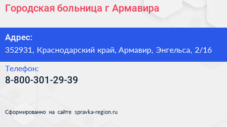 Городская больница г. Армавира по адресу 352931, Краснодарский край, Армавир, Энгельса, 2/16 в дальнейшем Организация, размещена в следующих категориях: