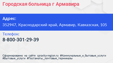 Городская больница г. Армавира по адресу 352947, Краснодарский край, Армавир, Кавказская, 105 в дальнейшем Организация, размещена в следующих категориях: