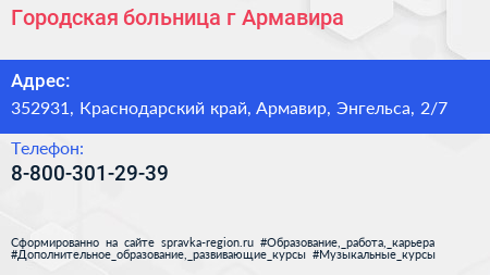 Городская больница г. Армавира по адресу 352931, Краснодарский край, Армавир, Энгельса, 2/7 в дальнейшем Организация, размещена в следующих категориях: