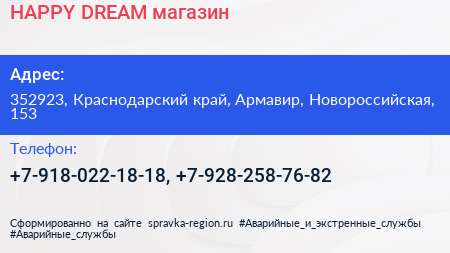 HAPPY DREAM, магазин по адресу 352923, Краснодарский край, Армавир, Новороссийская, 153 в дальнейшем Организация, размещена в следующих категориях: