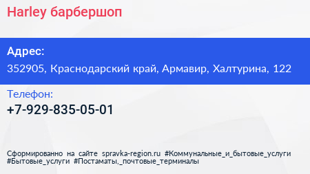 Harley, барбершоп по адресу 352905, Краснодарский край, Армавир, Халтурина, 122 в дальнейшем Организация, размещена в следующих категориях: