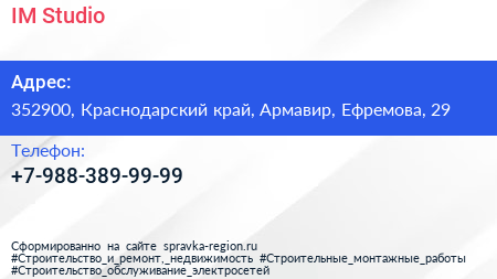 IM Studio по адресу 352900, Краснодарский край, Армавир, Ефремова, 29 в дальнейшем Организация, размещена в следующих категориях:
