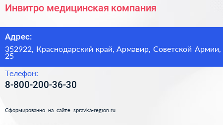 Инвитро, медицинская компания по адресу 352922, Краснодарский край, Армавир, Советской Армии, 25 в дальнейшем Организация, размещена в следующих категориях: