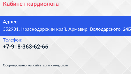 Кабинет кардиолога по адресу 352931, Краснодарский край, Армавир, Володарского, 24Б в дальнейшем Организация, размещена в следующих категориях:
