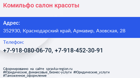 Комильфо, салон красоты по адресу 352930, Краснодарский край, Армавир, Азовская, 28 в дальнейшем Организация, размещена в следующих категориях: