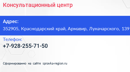 Консультационный центр по адресу 352905, Краснодарский край, Армавир, Луначарского, 139 в дальнейшем Организация, размещена в следующих категориях: