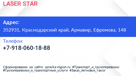 LASER STAR по адресу 352931, Краснодарский край, Армавир, Ефремова, 148 в дальнейшем Организация, размещена в следующих категориях: