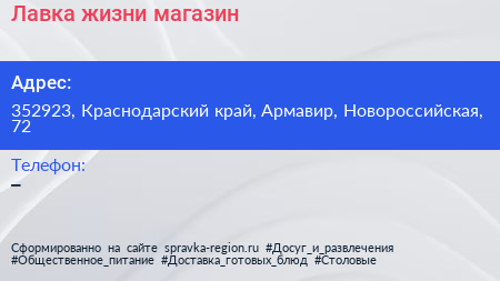 Лавка жизни, магазин по адресу 352923, Краснодарский край, Армавир, Новороссийская, 72 в дальнейшем Организация, размещена в следующих категориях: