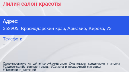 Лилия, салон красоты по адресу 352905, Краснодарский край, Армавир, Кирова, 73 в дальнейшем Организация, размещена в следующих категориях: