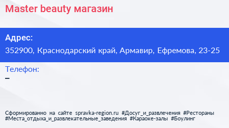 Master beauty, магазин по адресу 352900, Краснодарский край, Армавир, Ефремова, 23-25 в дальнейшем Организация, размещена в следующих категориях: