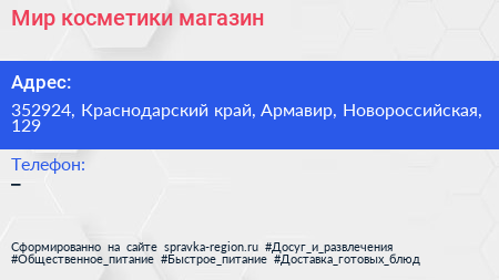 Мир косметики, магазин по адресу 352924, Краснодарский край, Армавир, Новороссийская, 129 в дальнейшем Организация, размещена в следующих категориях: