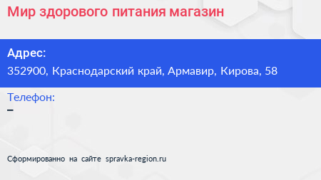 Мир здорового питания, магазин по адресу 352900, Краснодарский край, Армавир, Кирова, 58 в дальнейшем Организация, размещена в следующих категориях: