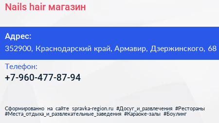 Nails hair, магазин по адресу 352900, Краснодарский край, Армавир, Дзержинского, 68 в дальнейшем Организация, размещена в следующих категориях: