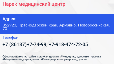Нарек, медицинский центр по адресу 352923, Краснодарский край, Армавир, Новороссийская, 70 в дальнейшем Организация, размещена в следующих категориях: