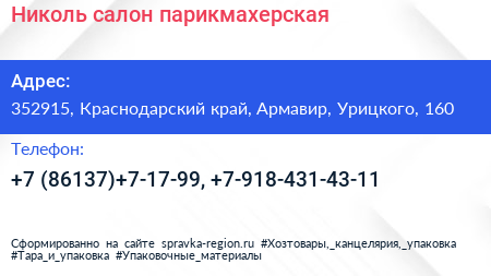 Николь, салон-парикмахерская по адресу 352915, Краснодарский край, Армавир, Урицкого, 160 в дальнейшем Организация, размещена в следующих категориях: