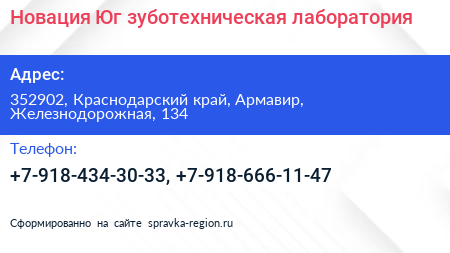 Новация-Юг, зуботехническая лаборатория по адресу 352902, Краснодарский край, Армавир, Железнодорожная, 134 в дальнейшем Организация, размещена в следующих категориях: