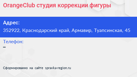 OrangeClub, студия коррекции фигуры по адресу 352922, Краснодарский край, Армавир, Туапсинская, 45 в дальнейшем Организация, размещена в следующих категориях: