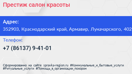 Престиж, салон красоты по адресу 352903, Краснодарский край, Армавир, Луначарского, 402 в дальнейшем Организация, размещена в следующих категориях: