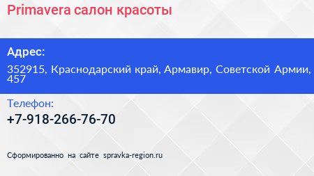 Primavera, салон красоты по адресу 352915, Краснодарский край, Армавир, Советской Армии, 457 в дальнейшем Организация, размещена в следующих категориях: