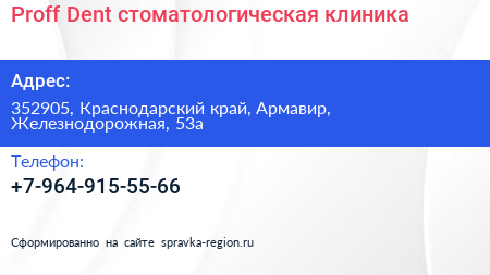 Proff Dent, стоматологическая клиника по адресу 352905, Краснодарский край, Армавир, Железнодорожная, 53а в дальнейшем Организация, размещена в следующих категориях: