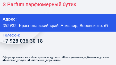 S Parfum, парфюмерный бутик по адресу 352932, Краснодарский край, Армавир, Воровского, 69 в дальнейшем Организация, размещена в следующих категориях: