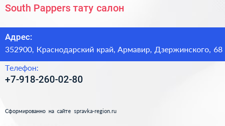 South Pappers, тату-салон по адресу 352900, Краснодарский край, Армавир, Дзержинского, 68 в дальнейшем Организация, размещена в следующих категориях: