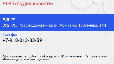 Stelli, студия красоты по адресу 352905, Краснодарский край, Армавир, Тургенева, 144 в дальнейшем Организация, размещена в следующих категориях: