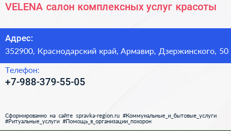 VELENA, салон комплексных услуг красоты по адресу 352900, Краснодарский край, Армавир, Дзержинского, 50 в дальнейшем Организация, размещена в следующих категориях: