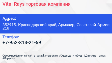 Vital Rays, торговая компания по адресу 352915, Краснодарский край, Армавир, Советской Армии, 218 в дальнейшем Организация, размещена в следующих категориях: