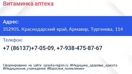 Витаминка, аптека по адресу 352905, Краснодарский край, Армавир, Тургенева, 114 в дальнейшем Организация, размещена в следующих категориях: