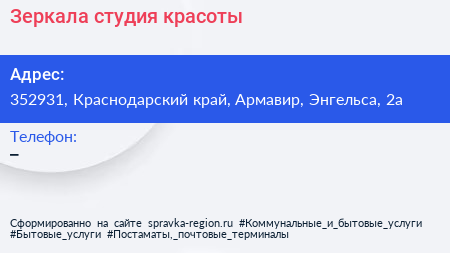 Зеркала, студия красоты по адресу 352931, Краснодарский край, Армавир, Энгельса, 2а в дальнейшем Организация, размещена в следующих категориях: