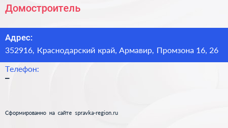 Домостроитель по адресу 352916, Краснодарский край, Армавир, Промзона 16, 26 в дальнейшем Организация, размещена в следующих категориях:
