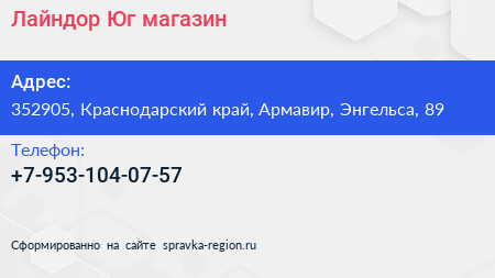 Лайндор Юг, магазин по адресу 352905, Краснодарский край, Армавир, Энгельса, 89 в дальнейшем Организация, размещена в следующих категориях: