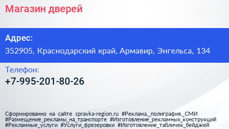 Магазин дверей по адресу 352905, Краснодарский край, Армавир, Энгельса, 134 в дальнейшем Организация, размещена в следующих категориях:
