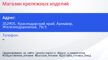 Магазин крепежных изделий по адресу 352905, Краснодарский край, Армавир, Железнодорожная, 76/1 в дальнейшем Организация, размещена в следующих категориях: