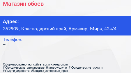 Магазин обоев по адресу 352909, Краснодарский край, Армавир, Мира, 42а/4 в дальнейшем Организация, размещена в следующих категориях: