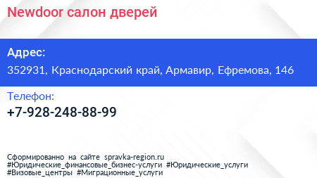 Newdoor, салон дверей по адресу 352931, Краснодарский край, Армавир, Ефремова, 146 в дальнейшем Организация, размещена в следующих категориях: